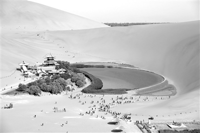 5月31日,游客在甘肃省敦煌市鸣沙山月牙泉景区游览。新华社发(张晓亮摄)