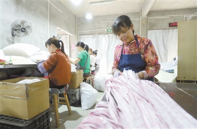 近年来,安福县帮助劳动密集型企业在社区和农村建立“微工厂”,将就业岗位送到群众家门口。图为5月28日,平都镇李家村村民在当地的软尺厂赶工。特约通讯员 刘丽强摄