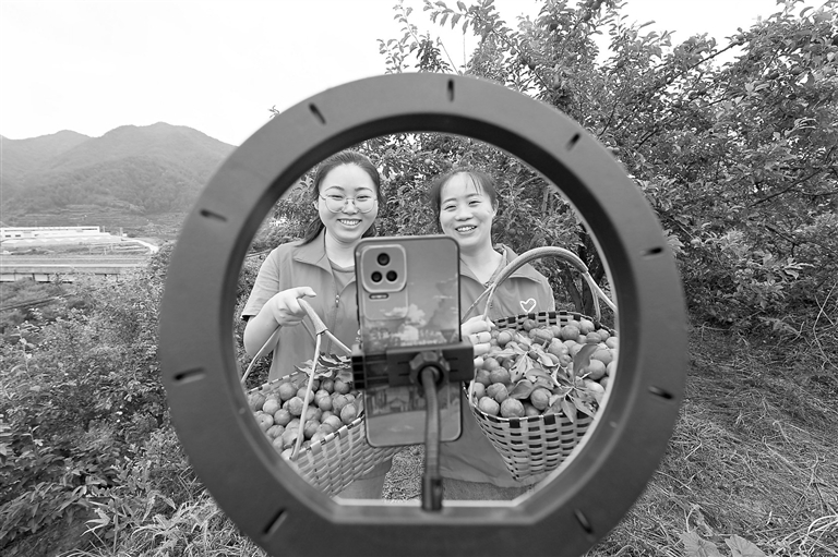 近年来,宁都县积极培育乡村主播人才,开展“党员直播 公益助农”志愿服务活动,推动本土农产品搭上“电商快车”,拓宽销售渠道。图为近日,宁都县青塘镇党员志愿者在富硒李子园帮助农户直播销售李子。本报全媒体记者 杨文斌摄