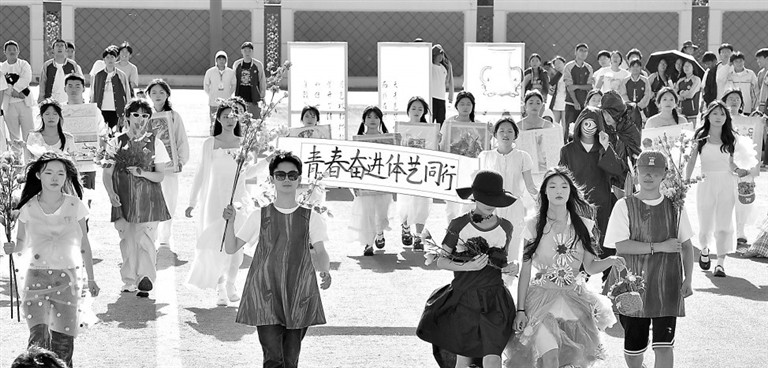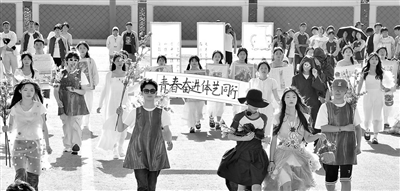 5月29日,乐平市第十中学田径运动场上,学生正在进行环保时装秀活动,旨在提醒人们养成保护生态环境的良好习惯。