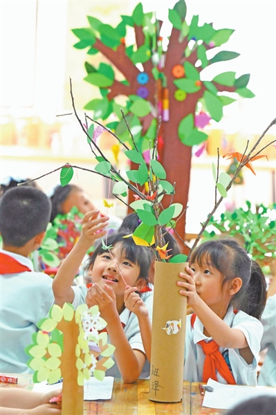6月4日,在河北省石家庄市柏林庄学校开展的“美丽中国我先行”保护环境主题活动中,学生们利用废弃物料制作“环保树”。新华社发 (陈其保摄)