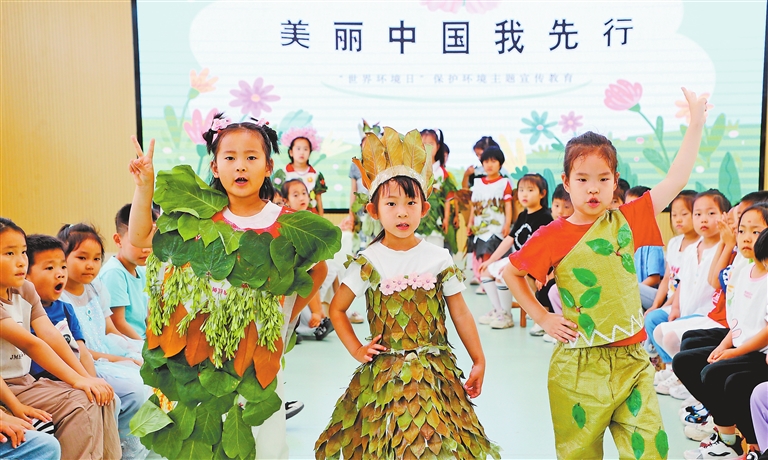 6月4日,山东省东营市东营区文苑幼儿园“环保时装秀”主题活动中,孩子们身穿用树叶等材料制成的环保服装进行展示。新华社发 (刘智峰摄)