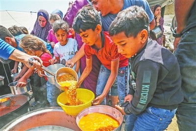 6月3日,巴勒斯坦人在加沙城领取食物。