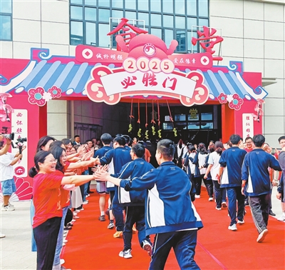 5月30日,南昌市豫章中学红角洲校区为2025届高三毕业生举办“逢考必胜”活动,让大家共享美食。该校希望通过这种轻松的方式为学生们加油打气,鼓励大家从容迎接高考。图为老师与学生击掌。