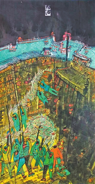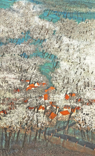 展厅中的绘画作品,个性鲜明的也有不少。黄玉平的国画《家乡印象》(左上图),以俯视的视角描绘了一幅“和谐乡村图”。农家瓦房在大片茂密的树丛中若隐若现,红色的屋顶、被薄雾轻罩的白色树林、远处青绿色的土地,三色搭配,清新明丽,意境悠远。下方辅以赭黑色的土地,给画面一种稳重感。钟秋演的国画《闹春》(左中图),表现的是乡村振兴、农民欢庆丰收的喜悦场景。在技法上,作者借鉴中国传统年画的表现手法,以中国画笔墨为载体,同时大胆运用西方绘画色彩,使之与中国传统水墨形成强烈的冷暖对比。建筑物和人物不完全写实,在具象与抽象之间,增强了画面的写意性和趣味性。
