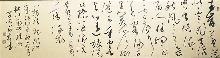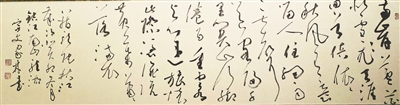第八届中国书法兰亭奖唯一金奖获得者宇文家林的草书横幅(左下图),是其典型的淡墨书风。为了帮助读者欣赏,不妨引用兰亭奖的颁奖词:“宇文家林草书主要师法晋唐,兼取宋元明诸家。其书作法度严谨而能疏放,风格妍美而能俊逸,气息优雅而能古淡,鲜明体现了传承中华美学精神、涵泳书法文化传统、融会新时代精气神的艺术理想与追求……”历史上喜欢用淡墨的书家,有晚明书风“尚淡”的董其昌、清代“淡墨探花”王文治等。淡墨书写,线条轻盈飘逸,然易失神采。在整体气韵的把握上,宇文家林此作无疑是成功的。