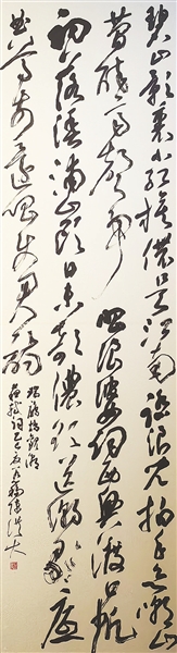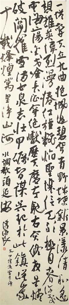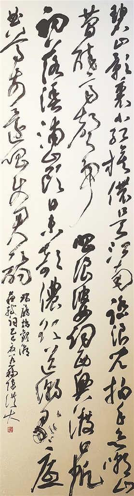 本次展出的作品整体水平较高,其中不少书法作者为当今全国书坛顶尖高手。北京陈海良的行书条幅(上右图),运笔讲求笔笔中锋,线条沉着劲健;字型追求八大山人的险绝和简约,整体看似平正的章法中蕴含勃发的张力。浙江陈洪大的草书条幅(上中图),章法、笔法、墨法颇为讲究,然最打动人之处,一是线条质量高,硬朗如钢丝;二是书写自然,不见丝毫做作,下笔墨浓,写枯再蘸,蘸墨次数或可历数,此非高手不能做到。