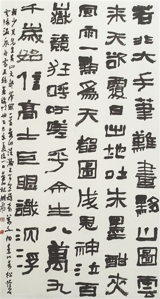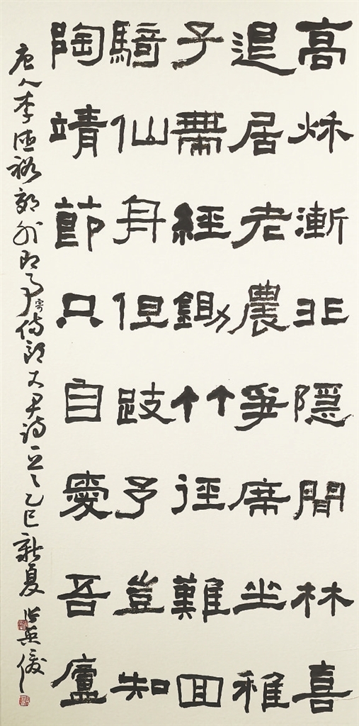 在展厅中,有多件隶书作品给人印象深刻。杜鹏飞的隶书中堂(下右图),以篆书笔法写隶书,线条苍劲,字型古拙;有列无行,章法灵动;墨色浓淡枯润,变化丰富。张英俊的隶书中堂(下中图),章法上采取传统的行距紧、字距宽形式,落款草书像一根线,将主体的隶书“串”成一体,使空灵的章法又不显松散。高手创作,笔笔讲究来历,却又不露痕迹,使人一眼看不懂出自哪一个碑帖。张英俊的隶书将《鲜于璜碑》《张迁碑》等汉代经典隶书融为一体,各取所长,从而逐渐形成了自己的艺术面貌。