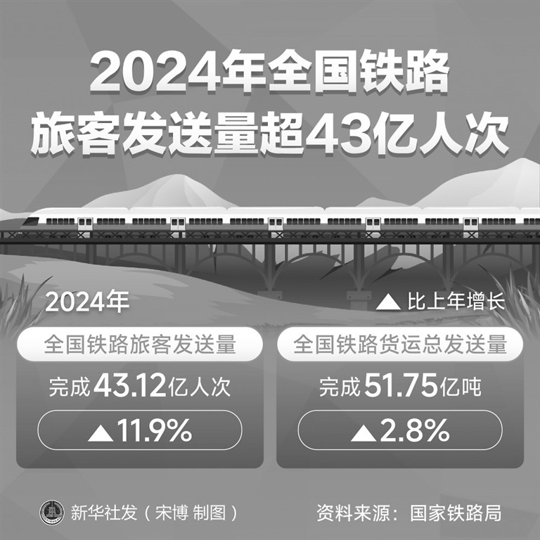 据新华社北京6月6日电 (记者叶昊鸣)记者6日从国家铁路局获悉,2024年,全国铁路旅客发送量完成43.12亿人次,比上年增长11.9%。
