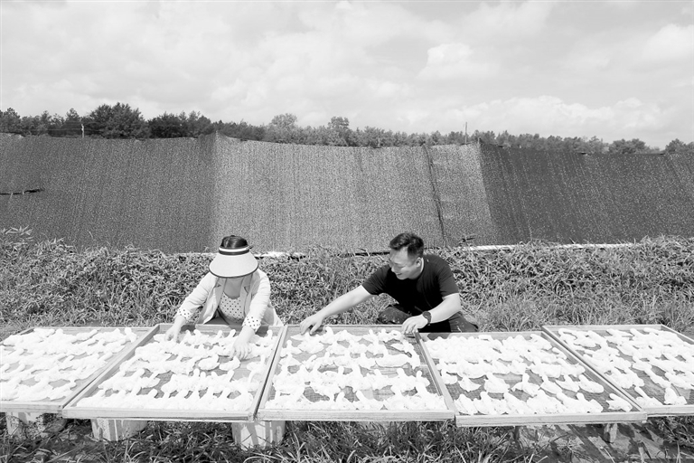 近年来,泰和县南溪乡积极发展竹荪菇种植、加工产业,带动农民就业增收,助力乡村振兴。图为5月30日,农民在晾晒竹荪菇。