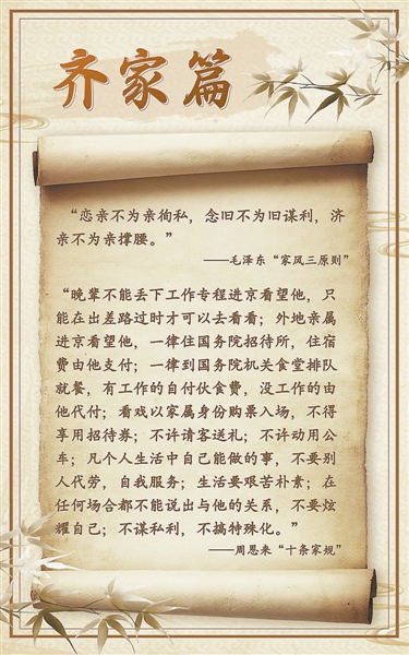 家风正则作风淳,好家风是党员干部修身律己的精神富矿。注重家风家教是中国共产党人的优良传统。毛泽东对孩子的要求是做一个普通人,对于请求帮忙找工作的亲友,严格实行不介绍、不推荐、不说话、不写信的“四不主义”;朱德经常教导子女要接班不要接官,并树立了“不准搭乘他使用的小汽车;不准亲友相求;不准讲究吃、穿、住、玩”的“三不准”家规。透过这些事例,我们能清晰地看见优良家风对权力寻租风险所形成的“绝缘层”,而现实中一些“衙内腐败”的案例也警示我们:没有家风“过滤网”,滥用公权力的毒素就可能通过亲情渠道渗透。继承中华优秀传统文化,弘扬革命前辈的红色家风,保持高尚道德情操和健康生活情趣,做家风建设的表率,教育子女亲属遵纪守法、艰苦朴素、自食其力,实乃新时代党员干部修身齐家的题中应有之义。
