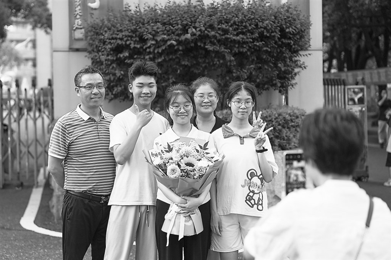 6月9日下午,在新余市第四中学考点,考生陆续走出考场,接受家长的鲜花和祝福。