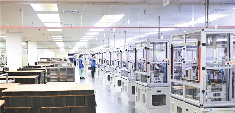 赣江新区围绕电子信息、智能装备、生物医药、新能源汽车,以及动力电池、有机硅新材料等主导产业补链强链延链,目前,新区规上工业企业656家,年营收亿元以上工业企业166家。图为6月9日,位于赣江新区的金霸王(江西)科技有限公司成品加工生产车间正有序生产。本报全媒体首席记者 海 波摄