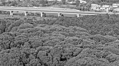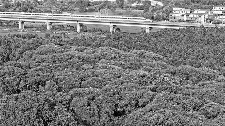 6月5日,新余市渝水区鹄山镇华家村,铁路旁郁郁葱葱的树林里栖息着大量白鹭,呈现出人与自然和谐相处的生态文明新图景。