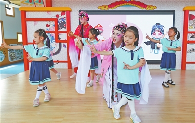 近年来,萍乡市积极推进京剧文化进校园。图为6月5日,该市实验幼儿园的小朋友在京剧老师的指导下感受和体验京剧文化。