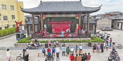 6月1日,广昌县甘竹老街孟戏广场,村民正观看精彩的广昌孟戏选段《姜女拾书》剧目表演。