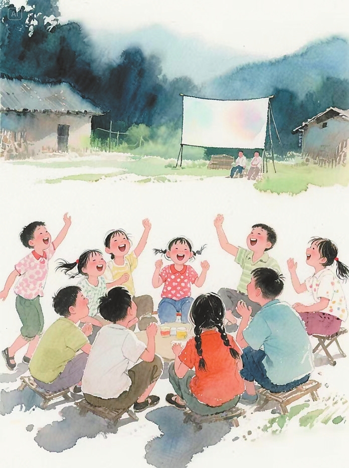 立时,操场便如烧开的油锅,沸腾起来。大人们迅速散开,加入各自的“朋友圈”,争分夺秒将平日积攒的小道消息、家长里短,在圈子里吐槽共享。小孩子则像原野上的兔子,蹦蹦跳跳四处撒欢。当然,这样的热闹,会在张叔打开机器,“啪”地射出一束强光对准两棵大树之间拽起来的幕布时,瞬间静止。