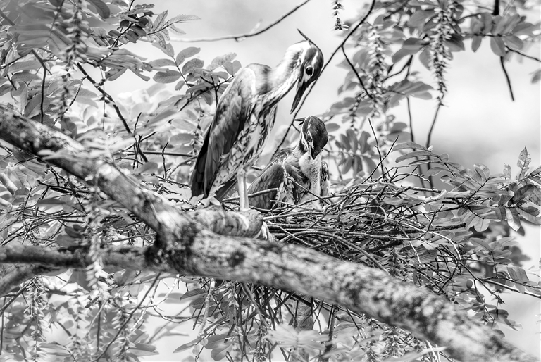 眼下正是鸟类繁殖育雏时节,在江西省武宁县伊山省级自然保护区,国家一级保护动物海南虎斑鳽成功在这里繁殖,填补了我省该物种繁殖记录空白。图为6月5日,在武宁县宋溪镇伊山村附近,一对海南虎斑鳽成鸟正哺育雏鸟。