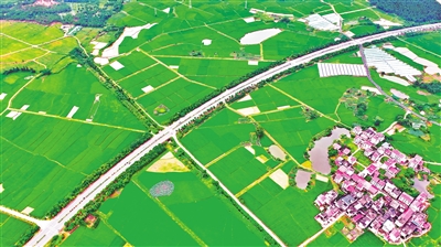近年来,永丰县不断完善交通基础设施,构筑外通内联的城乡立体交通网络。图为6月11日,佐龙乡西塘村的路网、田园、民居构成一幅夏日乡村美景。通讯员 刘浩军摄