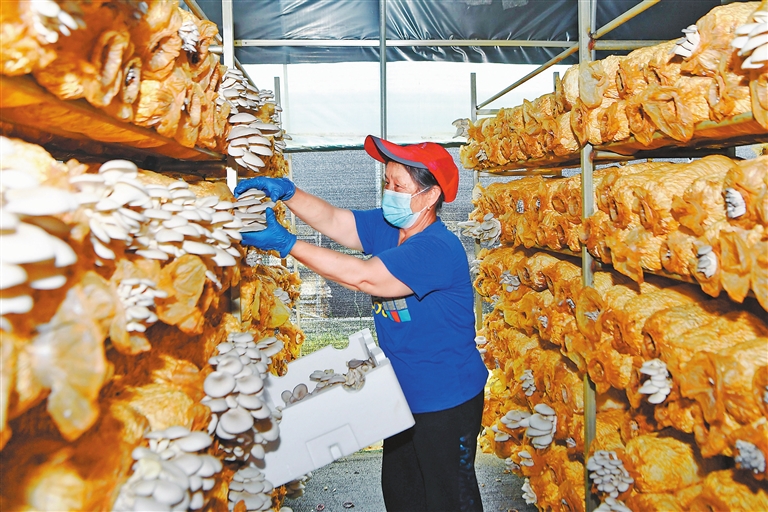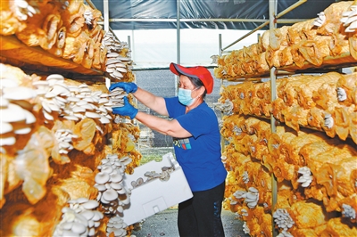 近年来,靖安县充分发挥得天独厚的生态优势,大力发展菌菇种植,带动当地村民就业增收。图为该县宝峰镇华坊村的菌菇基地大棚内,工人正忙着采摘菌菇。通讯员 易志钟摄