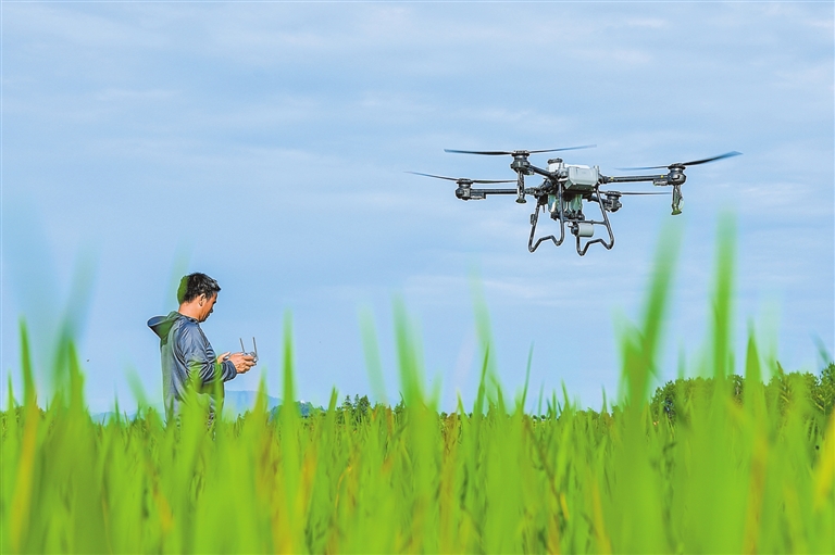 ◀ 6月5日,南丰县桑田镇古城村,农民飞手操控植保无人机对水稻进行“飞防”作业。