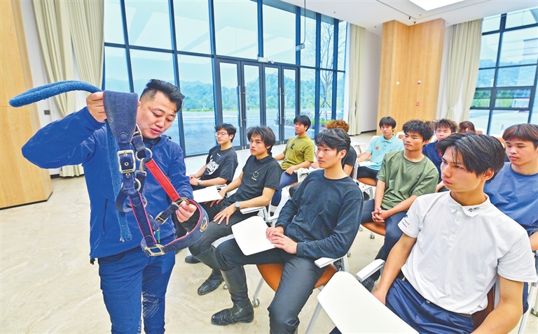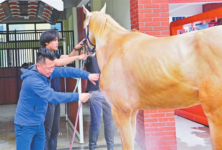 在会昌县和君职业学院的实训场地内,记者见到了李鸿,他正带领学生为一匹阿哈尔捷金马进行护理。完成日常照料后,学生们又来到室外训练场进行马术打圈练习。只见他们稳坐在马背上,手中缰绳轻轻牵动,精准地传达指令,骏马步伐轻盈而流畅。李鸿介绍,马术专业包括马匹护理、马房管理、马术竞赛与组织等课程。“我们不仅要培养会骑马的人,更要培养马术专业人才。”
