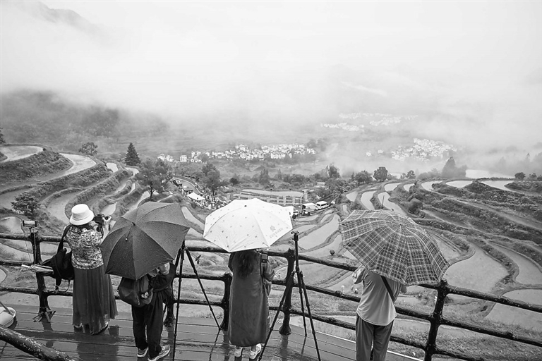 6月14日,婺源县溪头乡江岭村,梯田进入蓄水插秧期,层层梯田绵亘蜿蜒,线条丰富,如诗如画,引得游人纷至沓来。