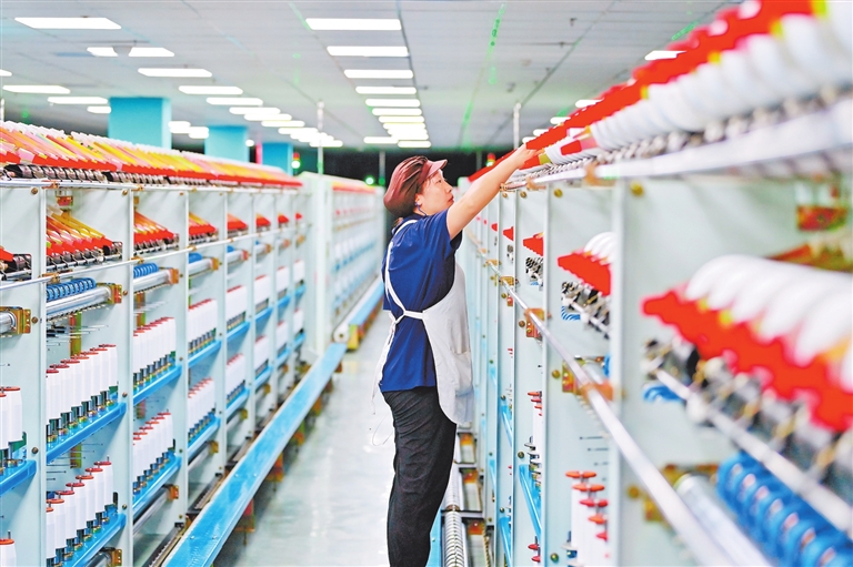 近年来,瑞金市坚持科技创新助力绿色发展,全力打造行业领先的5G智慧工厂,建成先进的数智化锦纶纺丝生产基地。图为江西申华新材料有限公司智慧车间内,工人在加工锦纶纺丝新材料产品。