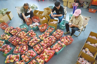 湖口县张青乡八方果园迎来丰收季,该果园通过“公司+村集体+基地+农户”模式经营。图为近日,果农在打包桃子。