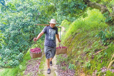 6月14日,分宜县紫玉杨梅基地杨梅喜获丰收,工作人员采摘杨梅供应市场。通讯员 刘志勇摄