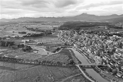 6月11日,无人机航拍新干县七琴镇钱塘村,绵延的青山、整齐的民居、绿油油的稻田,交织出一幅秀美乡村图。