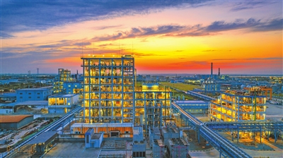 近年来,新干县纵深推进工业强县战略,加快盐卤药化首位产业转型升级,推动其向高端化、智能化、数字化迈进。图为6月16日黄昏时分,新干县盐化工业城内的江西兴氟中蓝新材料有限公司厂区灯火通明,一派生产红火的景象。 特约通讯员 李福孙摄