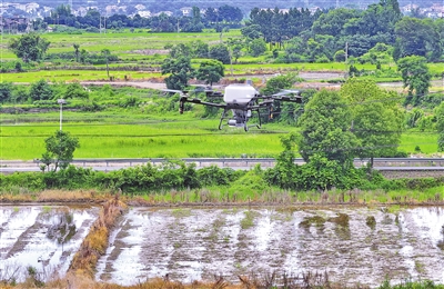 ▲ 近年来,安义县鼓励农户利用无人机进行农事作业。目前,该县共投入使用植保无人机60台,服务全县33.41万亩耕地。图为6月20日,农户操控植保无人机在田间施肥。