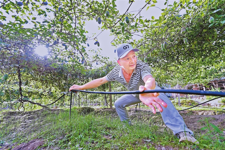 ◀ 鹰潭市龙虎山景区引进气象监测、视频传感等装置系统,以科技赋能促进农业增效。图为6月17日,上清镇城门村八月瓜特色农产品基地,村民在调试水肥一体化设备。