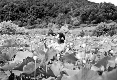 近日,万年县珠田乡越溪田园荷花种植基地荷花进入盛花期,吸引游客前来打卡赏荷。图为6月21日,游客在该基地拍照。 特约通讯员 徐声高摄