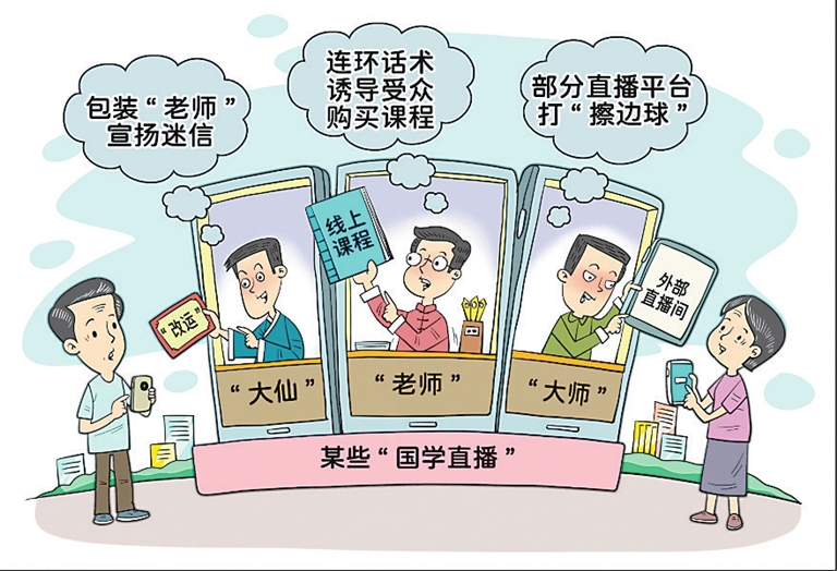 近期,一些网络直播平台账号以传播“国学”或“传统文化”的名义,引导受众购买价格动辄数千元、迷信色彩浓厚的线上课程。尤其是对一些中老年群体,不少主播利用他们对自身健康和子女前途的担忧,编造“血光之灾”“寿命威胁”等虚假信息,迫使其购买课程或服务。对此,相关部门应加大打击力度,督促直播平台落实主体责任,净化网络空间。