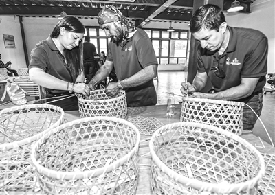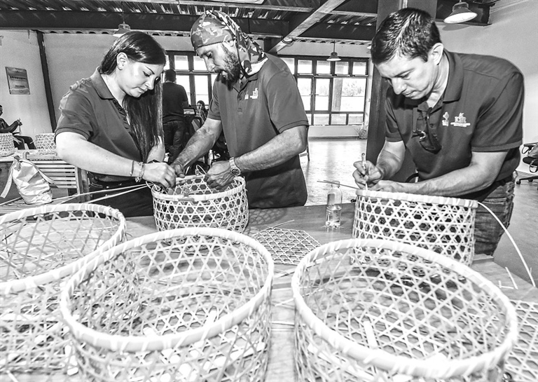 6月8日至6月22日,来自厄瓜多尔共和国的29名学员来到资溪,开展为期14天的毛竹产业精深加工技能实操培训。图为6月19日,外国学员在资溪县竹科技博物馆学习编织竹篮。特约通讯员 吴志贵摄