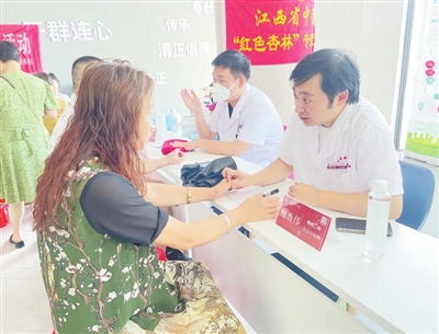 6月17日上午,江西省中医院团委组织睡眠医学中心、治未病中心、肿瘤科、儿科、糖尿病科(内分泌科)、心血管病科、脊柱二科、耳鼻咽喉科和急诊综合科的医护专家,前往南昌高新区艾溪湖管理处鱼尾洲社区开展“红色杏林”专家义诊活动,把优质的医疗资源送到群众身边。 唐 岳摄