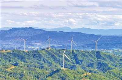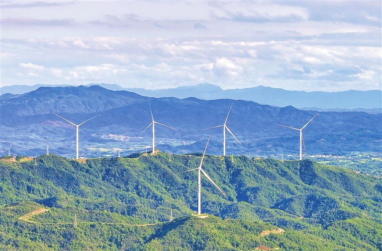 近年来,南城县大力发展风力发电、光伏发电等新能源项目建设,努力构建多元化的新能源产业体系,为地方经济可持续发展注入新的活力。图为6月17日,该县毕姑山风电场,风叶机叶片缓缓转动,将绿色电能源源不断送入千家万户。本报全媒体记者 吴文兵摄