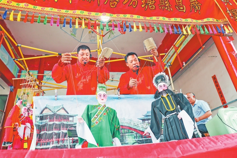 6月18日,广昌县塘坊镇塘坊木偶戏剧团艺人在大株村戏台为村民表演木偶戏剧。特约通讯员 曾恒贵摄