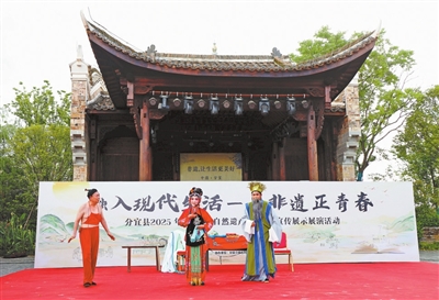 6月14日,民间剧团演员在分宜县分宜镇介桥古村表演折子戏《子才打赌》。特约通讯员 袁建兵摄