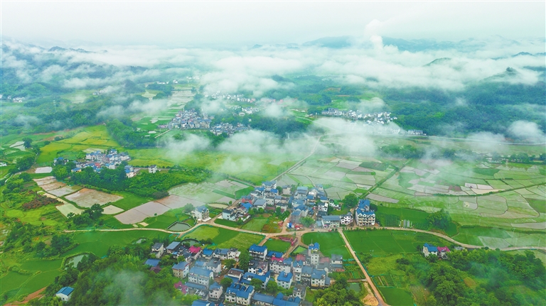 6月24日,横峰县青板乡上空云雾缭绕,错落有致的民居半掩于流动的云霭之下,远望山野,田野山峦在薄纱般的雾气中若隐若现,美不胜收。通讯员 薛 南摄