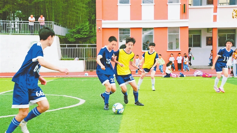 球场上,孩子们积极比拼,展现出对运动的热爱。“开场表演者、现场解说员、裁判员、记分员,都由学生自发担任,我们鼓励更多孩子加入‘班超’。”该校副校长彭运良表示,“学校以班级为单位,组建了14支球队,参与联赛的人数占全校学生总数的80%。”