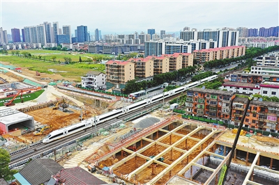 南昌市青云谱区广州路下穿京九铁路隧道工程是一项重大城市基础设施建设项目,建成后将有效缓解区域交通压力,为市民提供更加便捷、高效的交通出行体验。图为6月19日,一列高铁驶过施工现场。本报全媒体记者 洪子波摄