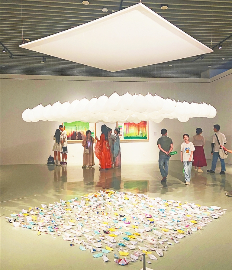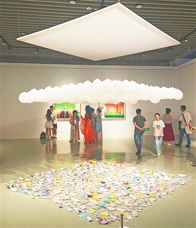 费德里克·阿尔诺的装置作品《纸船》(上图),以150只纸船承载150个孩子的梦想,用漂浮的气球营造梦想的纯洁与未来感。这件作品富有层次的空间呈现,打破了我们传统的平面观看方式。此作吸引了许多观众打卡,这也体现了观众与艺术家的一种交流和互动。