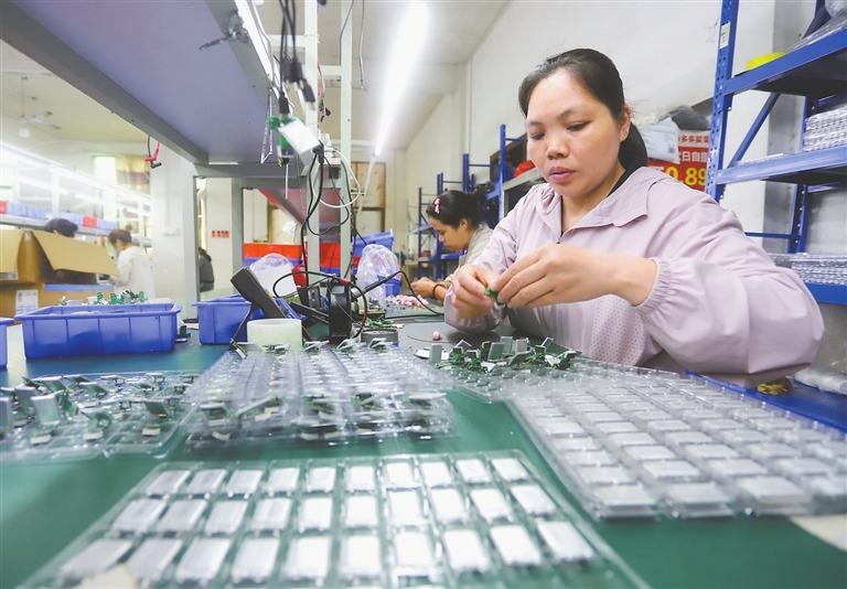 近年来,安福县打造“村头工厂”,拓宽企业用工渠道,助力村民增收。图为6月22日,该县洋门乡洋门村,村民在电子厂车间加工零部件。
