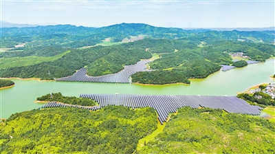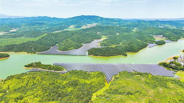 6月26日,俯瞰抚州市临川区高坪镇金龙水库,一排排光伏板排列整齐,正源源不断地产生绿色电能。通讯员 郭 昊摄