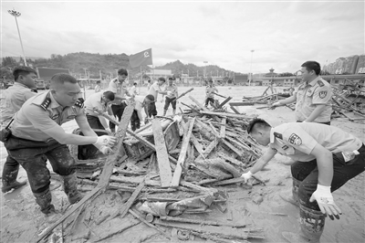 6月29日,在贵州省榕江县“村超”球场,来自丹寨县公安局的党员民警潘建航(左二)和同事一起清理因洪灾受损的球场设施。