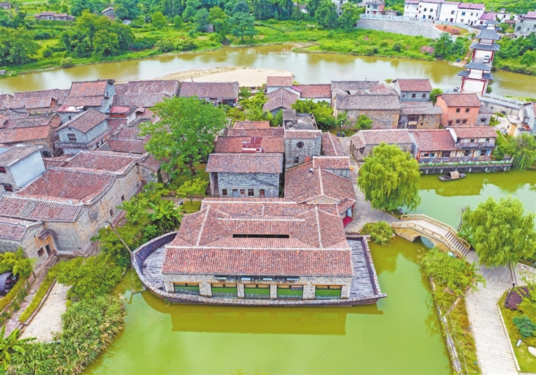 ◀近年来,南丰县整合古村落、农耕文化、文旅产业和生态资源,全力打造农文旅深度融合的洽湾船形古镇景区,吸引各地游客前来打卡。图为6月18日,航拍静卧于沧浪河湾之畔的洽湾古镇。