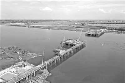 ▲6月25日,在南昌北二绕城高速公路德胜大桥跨赣江西支施工现场,工人们正在进行钢栈桥施工作业。据介绍,该桥全长2462米,采用多种跨径组合,是省内高速公路首次采用此结构建设的大桥。本报全媒体记者 洪子波摄
